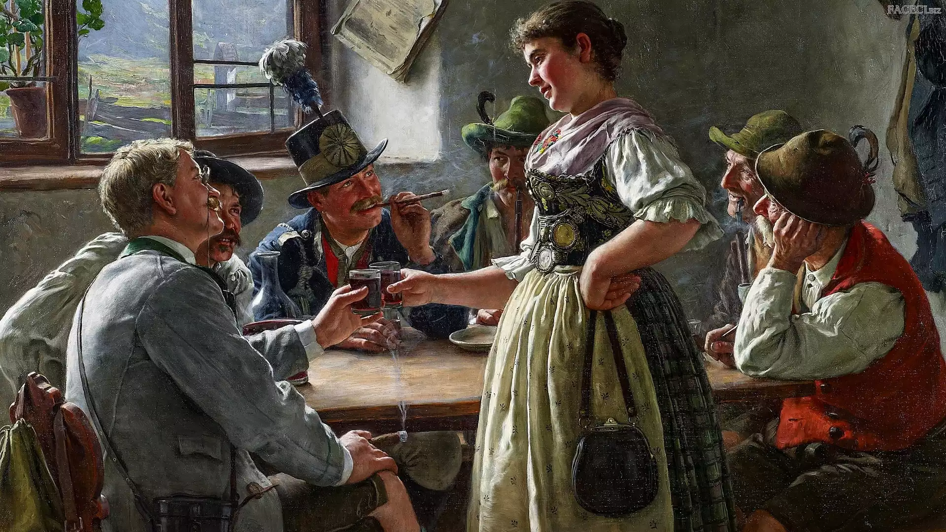 Emil Rau, Stolik, Kobieta, Malarstwo, Toast, Karczma, Mężczyźni, Okno - faceci.biz